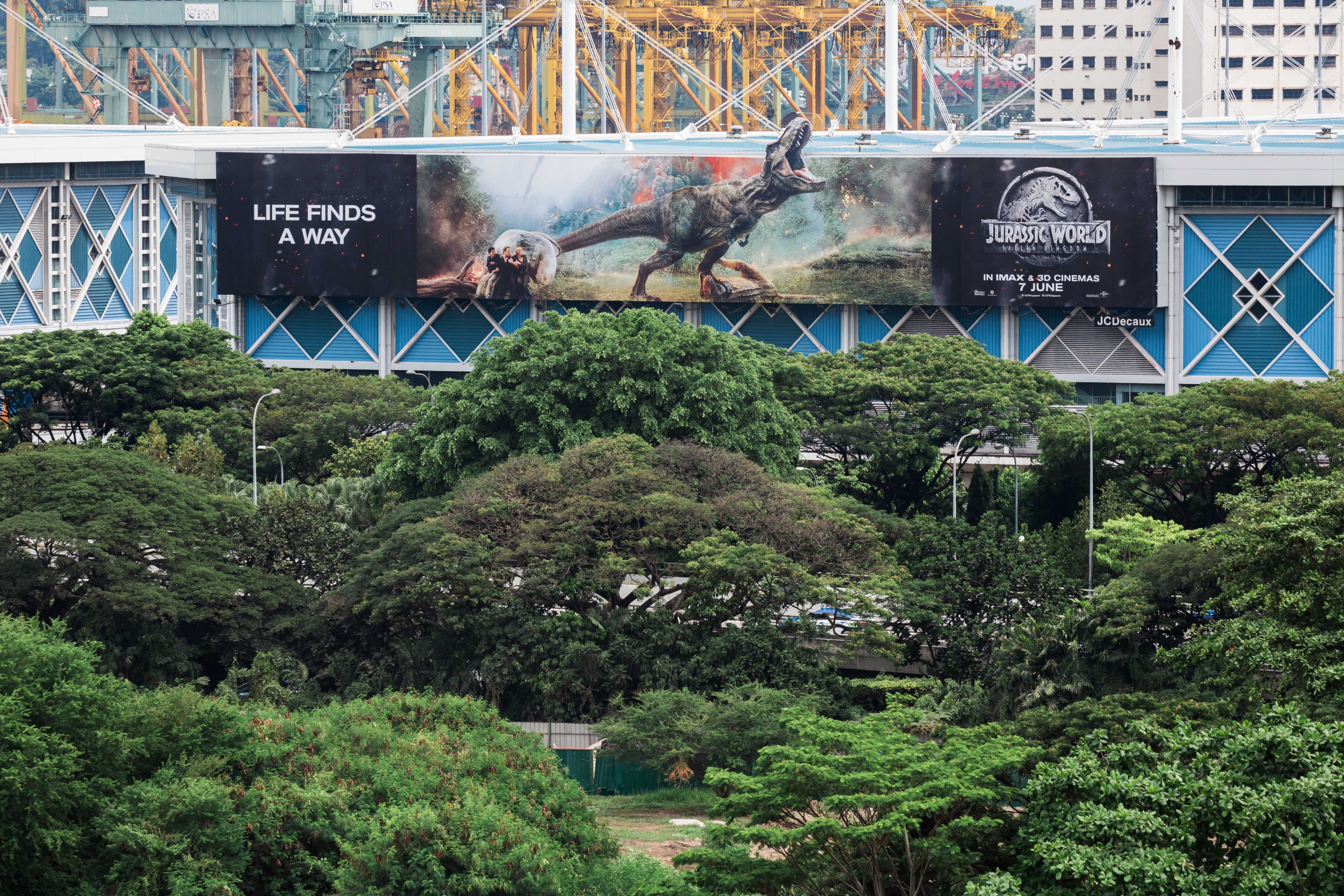 A larger-than-life two-dimensional die cut at 513 Keppel Road was built to promote United International Pictures’ advertising campaign for JURASSIC WORLD: FALLEN KINGDOM. The 8m by 60m outdoor large format billboard featured a dinosaur superimposed against a backdrop of tropical trees from the surroundings, resembling scenes from the movie in which dinosaurs emerge from the jungle into a modern-day setting.