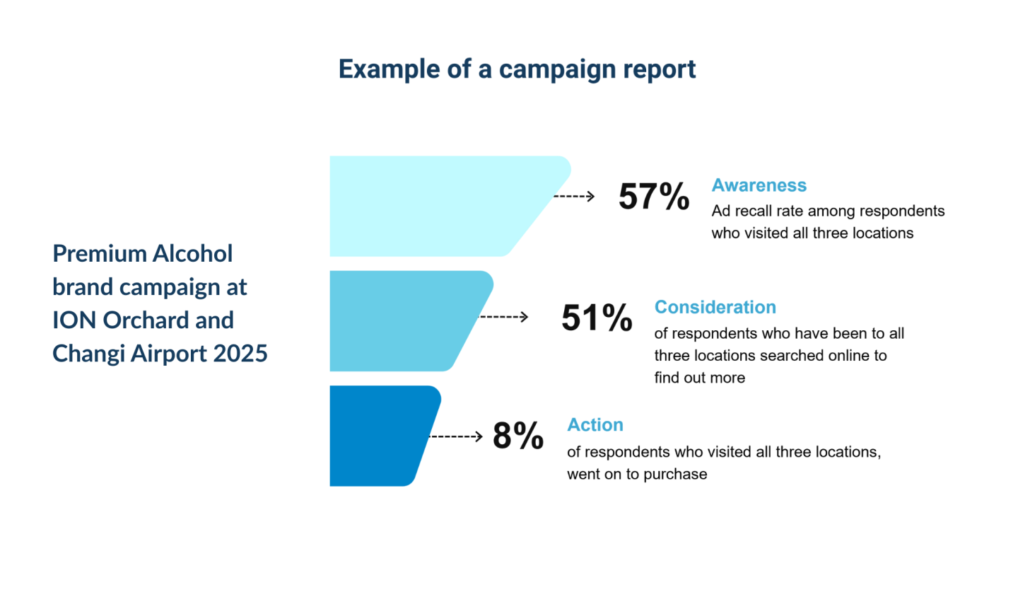 Harnessing data gathered from sensors, we track incremental footfalls following a drive-to-store campaign, or brand metrics after a branding campaign with custom surveys. Leverage measurement solutions to objectively assess your campaign impact and areas for growth and future optimization.